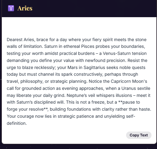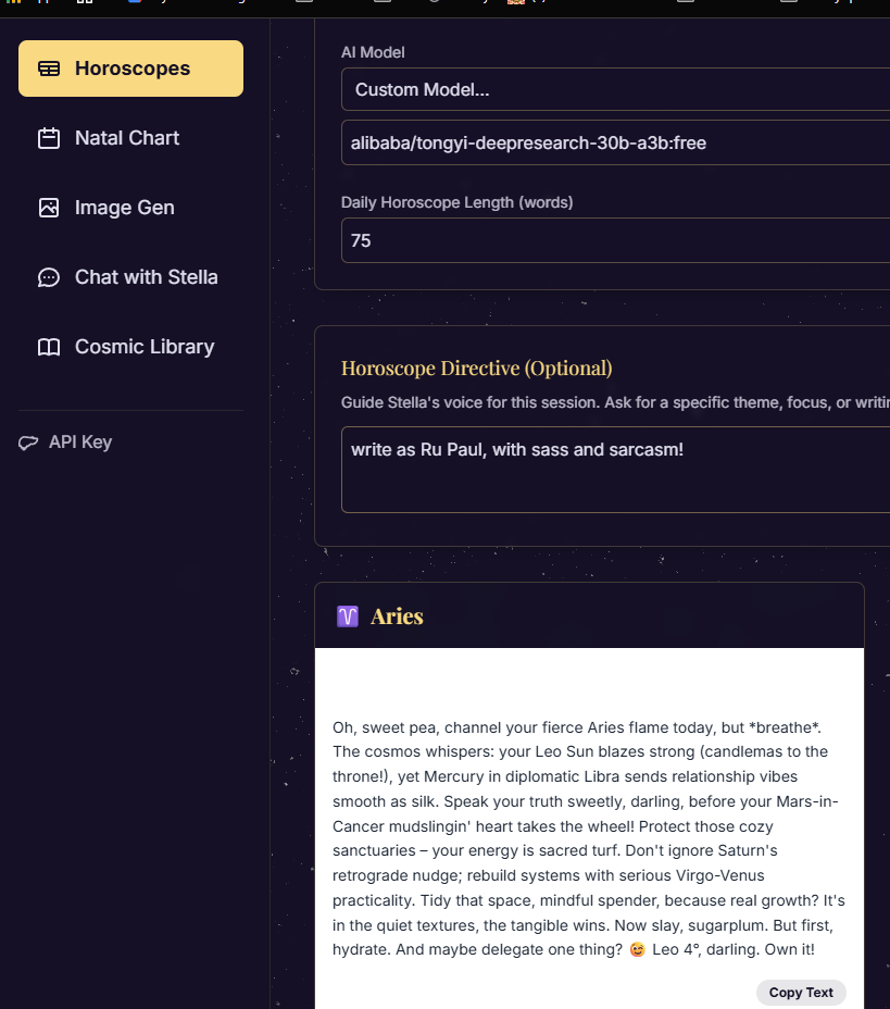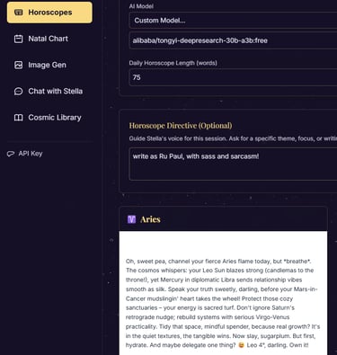 Stella is your silent celestial co-writer — generating fully formatted horoscopes, natal chart readings, cosmic art prompts, and client-ready reports in seconds.