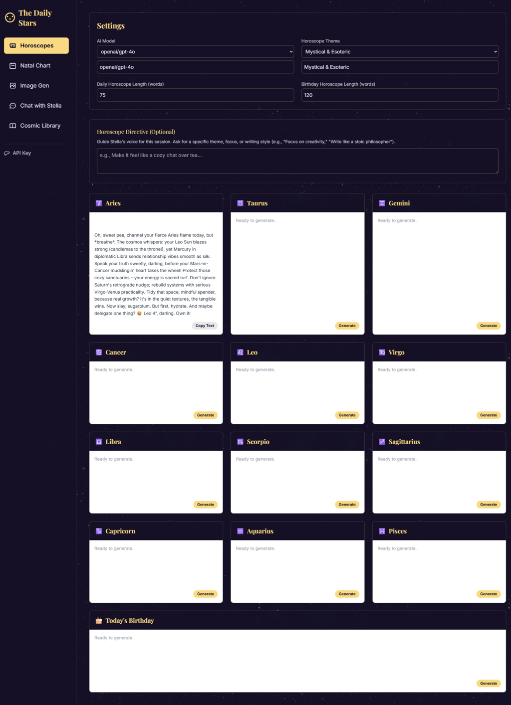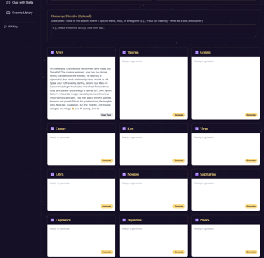 Custom Directive Box — Override Stella’s voice completely. Enter a micro-style note like: “Write like a Gen Z astrology meme account” or “Make it poetic like Rumi.”