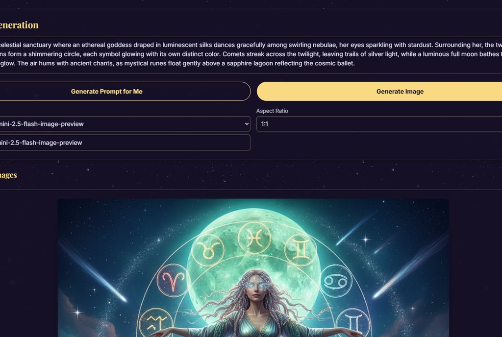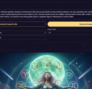 Prompt Assistant (“Generate Prompt for Me”) — Writes rich, aesthetic prompts based on mystical vocabulary and celestial imagery, so users don’t need prompt engineering skill.