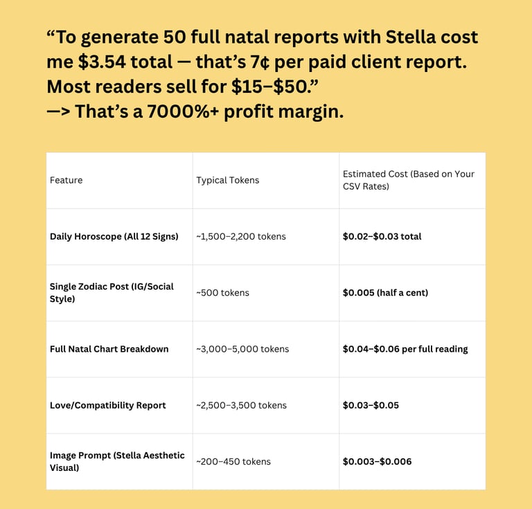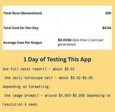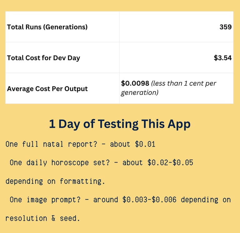 “I ran Stella all day long while building — generating full natal reports, horoscopes, image prompts — and the ENTIRE cost came to $3.54. When I ran out of balance, I switched to a free model and kept going with barely any drop in quality.”