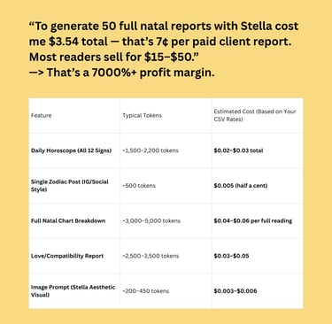 Creator-Safe Economics — Even at paid model rates, the cost to generate a $20 chart report is under 6 cents. That’s a 3,000% profit margin or higher.