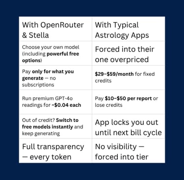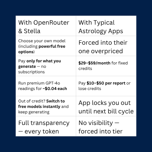 With OpenRouter & Stella With Typical Astrology Apps Choose your own model (including powerful free options) Forced into their one overpriced engine Pay only for what you generate — no subscriptions $29–$59/month for fixed credits Run premium GPT-4o readings for ~$0.04 each Pay $10–$50 per report or lose credits Out of credit? Switch to free models instantly and keep generating App locks you out until next bill cycle Full transparency — every token spent is logged No visibility — forced into tier upgrades