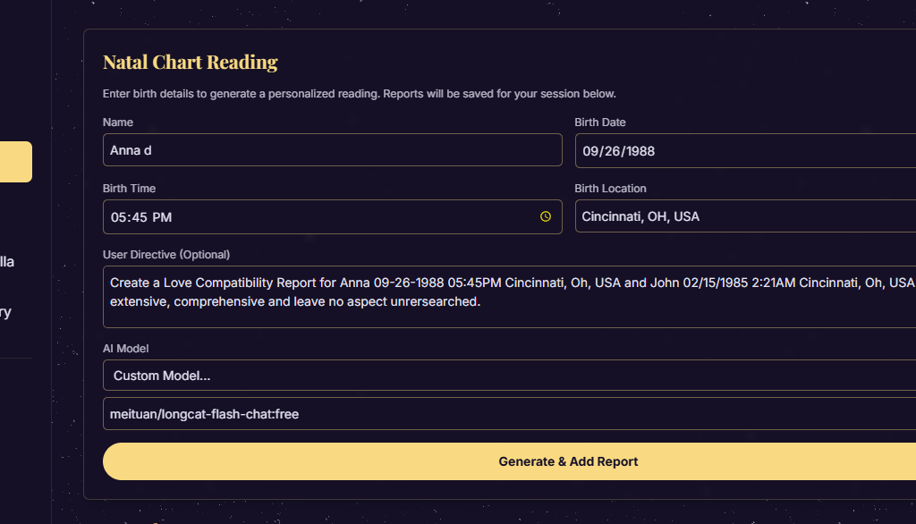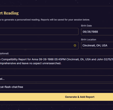 Client Input Fields (Name, Birth Time, Location) — Enter custom client data for personalized chart generation.